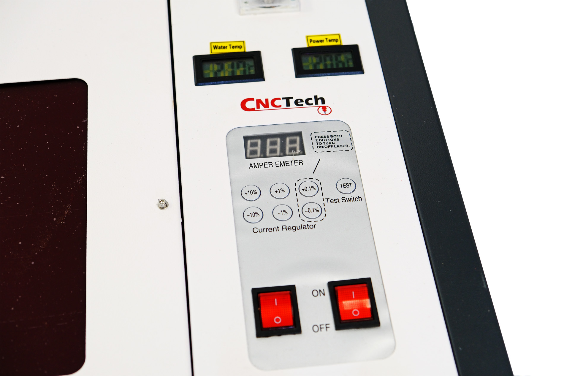 De CO2 lasergraveermachine 40W 40x40 cm is uitgerust met een digitaal besturingssysteem dat zorgt voor een nauwkeurige instelling van de lasersterkte tot op 0,01% en biedt herhaalbaarheid en precisie in de instellingen. De lasersterkte kan eenvoudig worden geregeld via knoppen aan de voorzijde van de machine.