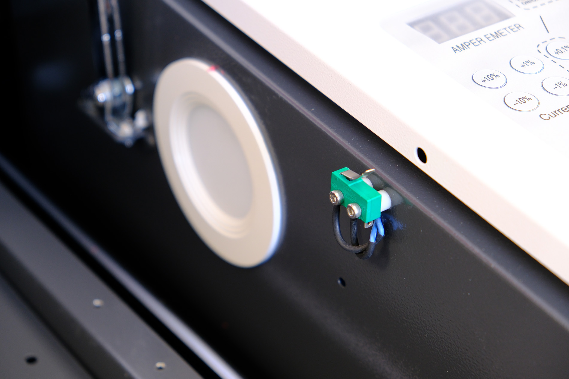 Air Assist functie: De "Air Assist" functie, zichtbaar op de bijgevoegde afbeelding, is fabrieksmatig geïnstalleerd. Het lucht wordt direct uit dezelfde opening als de laserstraal geblazen, wat de resultaten aanzienlijk verbetert bij het werken met verschillende materialen die luchtstroom vereisen.