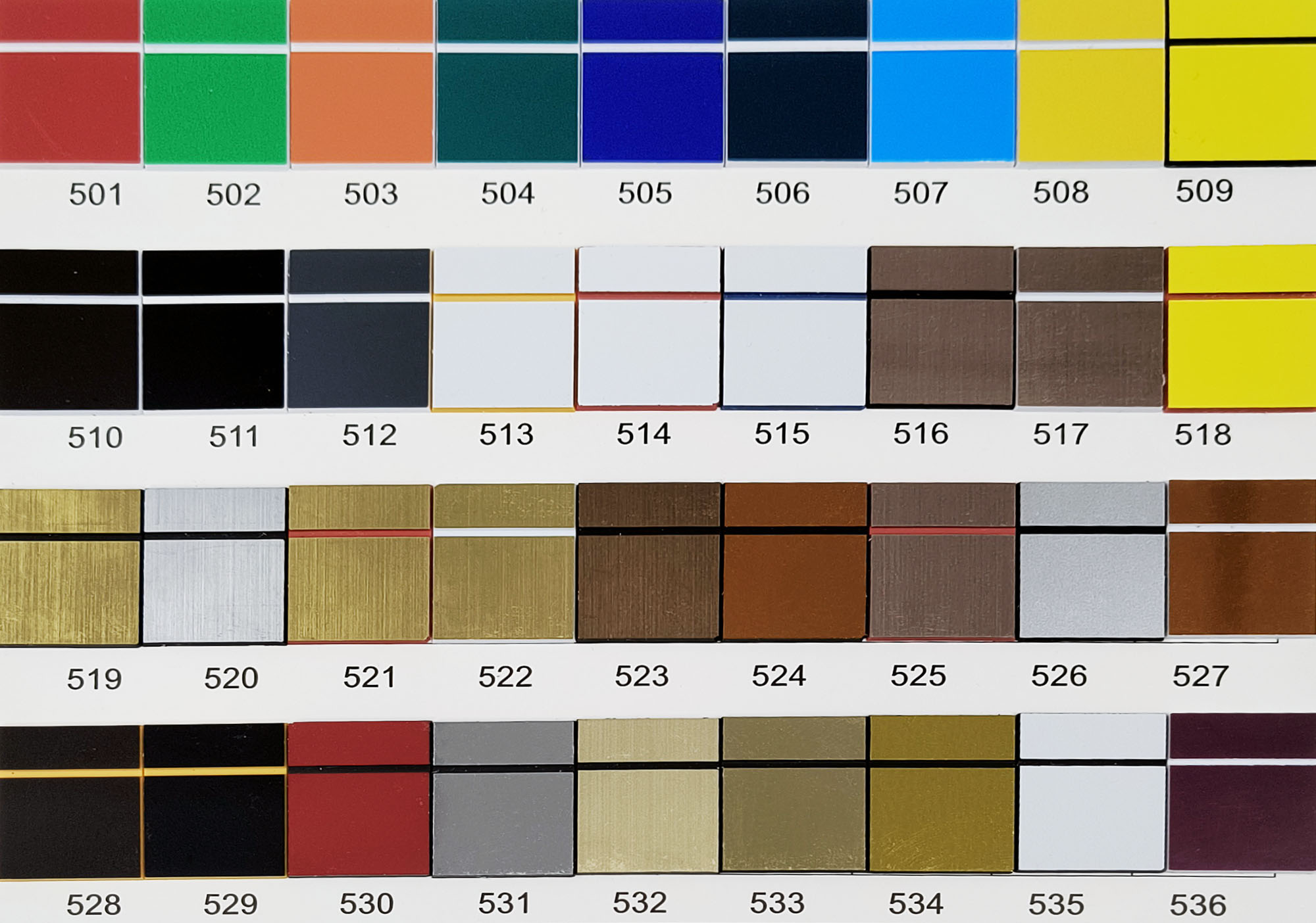 Matte kleuren: 501 | 502 | 503 | 504 | 505 | 506 | 507 | 508 | 509 | 510 | 511 | 512 | 513 | 514 | 515 | 518 | 526 | 528 | 529 | 530 | 532 | 535 | 536