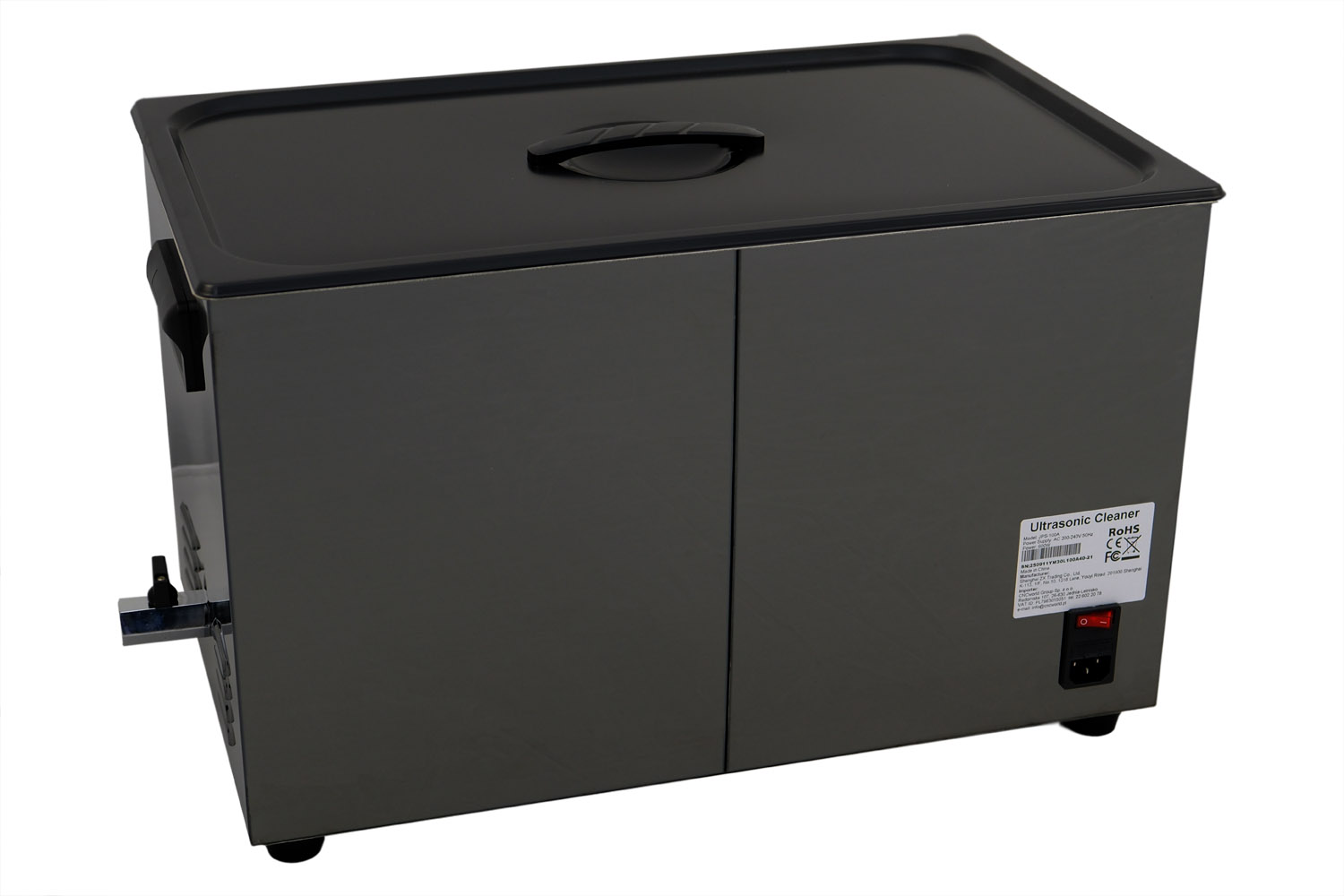 De ultrasoonreiniger GX100A is uitgerust met een tank van hoogwaardig roestvrij staal SUS304 met een inhoud van 30 liter, een ultrasoon vermogen van 600 W en een verwarmingsvermogen van 500 W.