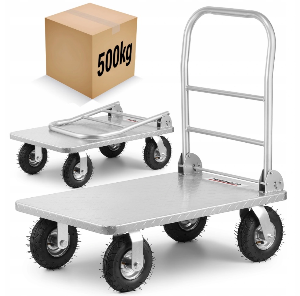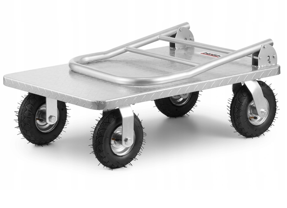 Ja - hier is hij er al, een platformwagen met opblaasbare wielen die op elk terrein werkt. Waarom de nieuwigheid? Ons vorige wagenmodel was volledig opnieuw ontworpen en in feite vanaf de grond af ontworpen. In navolging van de meningen van onze klanten hebben we sterke en duurzame wielen geleverd met lagers die elk type oppervlak aankunnen. Wat het meest is veranderd, is het platform - het gebruikelijke standaardplatform is vanwege zijn lage sterkte vervangen door een stalen platform van duurzaam staal met extra verstevigingen die voorkomen dat het platform vervormt onder invloed van gewicht. Eindelijk een licht gewijzigde handgreep - ergonomischer en versterkt - aangepast aan het draagvermogen van de kinderwagen. Zo'n kinderwagen vind je nergens, omdat hij het resultaat is van onze eigen verbeteringen.